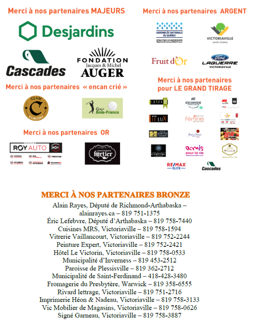 Le Centre de prévention suicide Arthabaska-Érable est fier et très reconnaissant de pouvoir compter sur ces commanditaires majeurs depuis près de 20 ans : Cascades, Desjardins et la Fondation Jacques et Michel Auger.